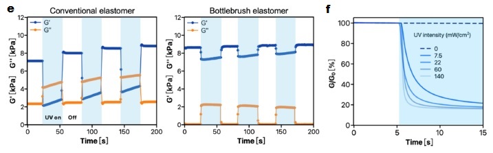 The above video demonstrates its remarkable shaping where the researchers used an elastomer strip (Figure a) cut it in half, and completely separated it. The two pieces were loosely re-aligned and re-joined together. UV irradiation was applied for approximately 10 seconds while holding the flat, bent, or coiled shape, which then the two elastomer pieces are "grafted," resealed, and self-healed within seconds. The grafted BBE retained its hardness, strength, and new shape as a single piece after the UV light was removed. This resealing process recovers approximately 86% of its original hardness after UV exposure. Conventional elastomers have no response to UV irradiation as shown in Figure e. In Figure f, the intensity of UV illumination is shown in the solid lines, and the relaxation of the elastomers occurs within 5 seconds. The dashed line represents the elastomer applied by no UV illumination.