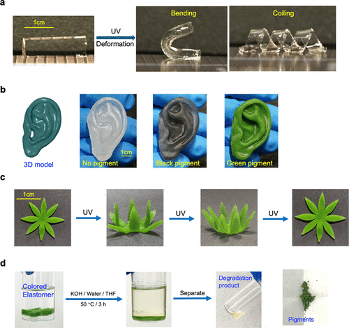 The printed BBE also has a recycling process to degrade the printed elastomer into a liquid state, where it can be then separated from pigments as shown in Figure d. This highlights the potential for sustainable use in additive manufacturing, enabling the separation and reutilization of degradated products.